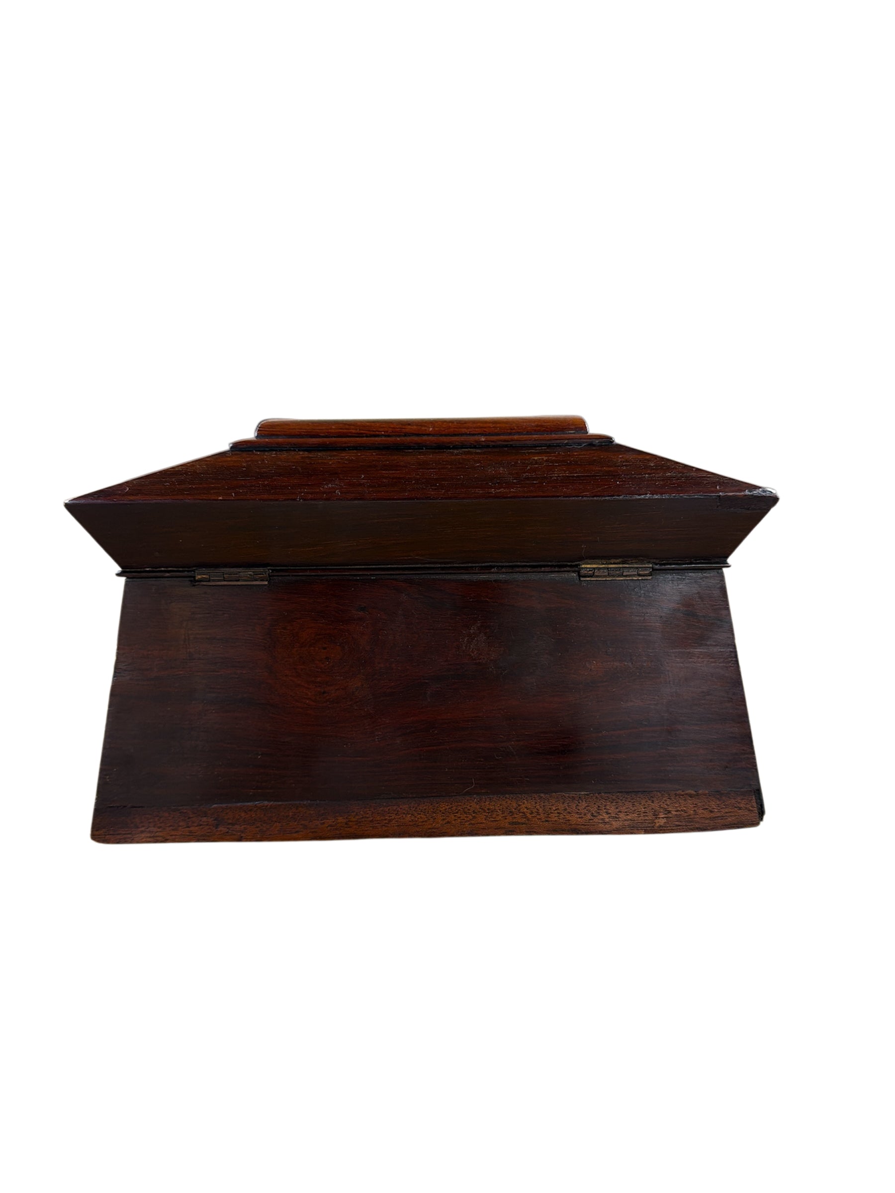 A beautifully crafted antique rosewood box featuring a sloped lid and elegant keyhole detail. The rich grain and warm patina highlight the natural beauty of the wood, giving this piece timeless appeal. Once used for storing valuables or writing instruments, it now serves as a refined decorative accent—perfect atop a desk, console, or stacked among collected treasures.