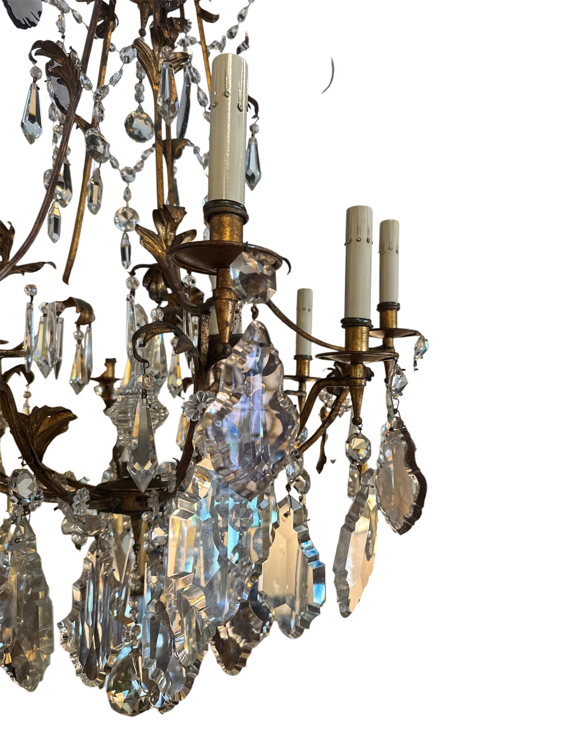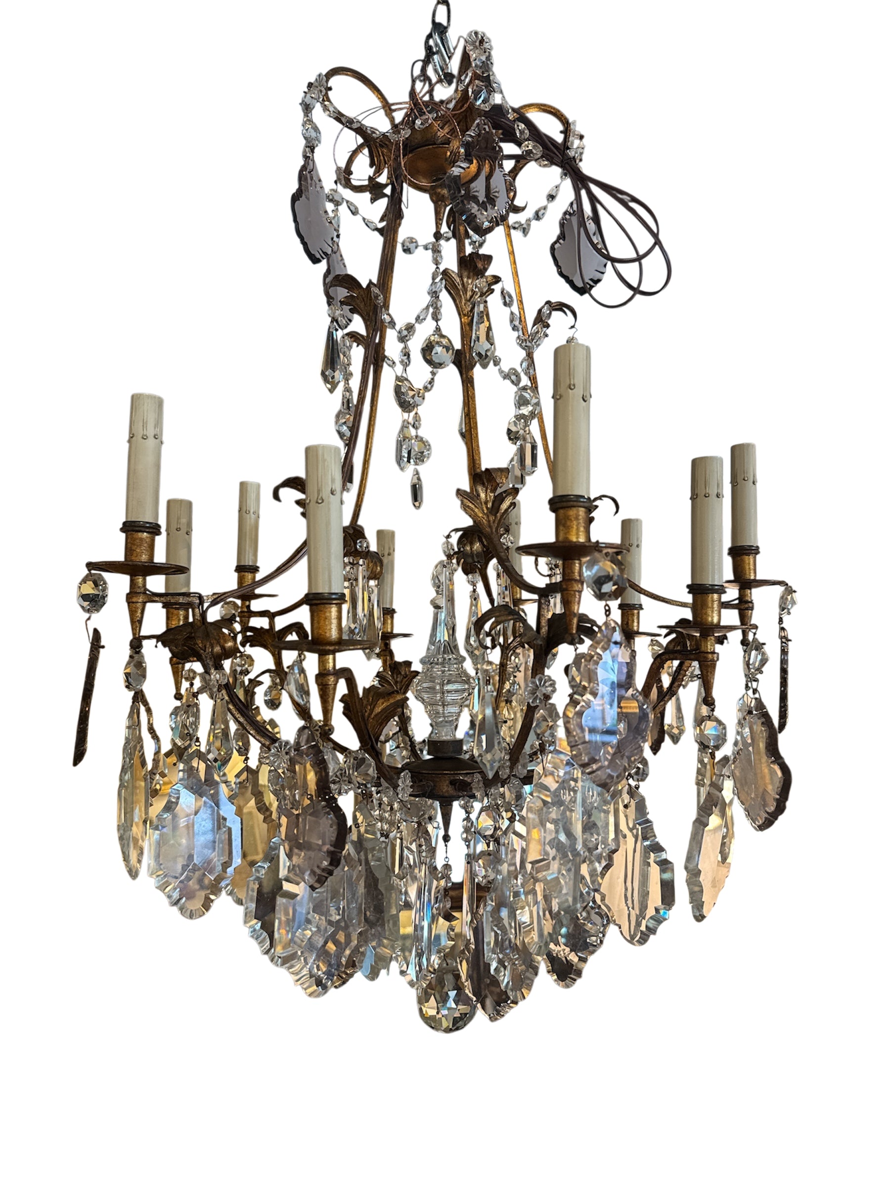 This exquisite antique chandelier features a richly patinated gilt metal frame adorned with ornate foliate detailing and draped crystal garlands. Ten candle-style arms extend gracefully, each fitted with faux wax candle sleeves. The standout feature of this piece is its beautiful array of faceted crystal drops, interspersed with rare light purple prisms that catch and scatter light with a soft, romantic glow. Perfect for adding a touch of European elegance to a dining room, foyer, or grand bedroom. Wired and ready for installation.