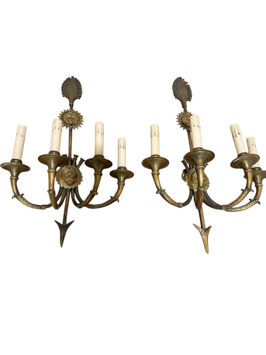 Elevated, timeless, and rich with detail — this striking pair of vintage brass sconces brings classic European elegance to any space. Each sconce features four graceful candle-style arms with beautifully aged patina, intricate foliate accents, and a bold lion-mask medallion at the center. The vertical stem is topped with a decorative plume and sunburst motif, giving the pair a distinctly neoclassical feel. Perfect for flanking a mirror, anchoring a hallway, or adding warmth to a dining room or study, these sconces make a statement without overwhelming a space. Their sculptural quality and refined silhouette blend seamlessly with traditional, eclectic, and layered interiors.