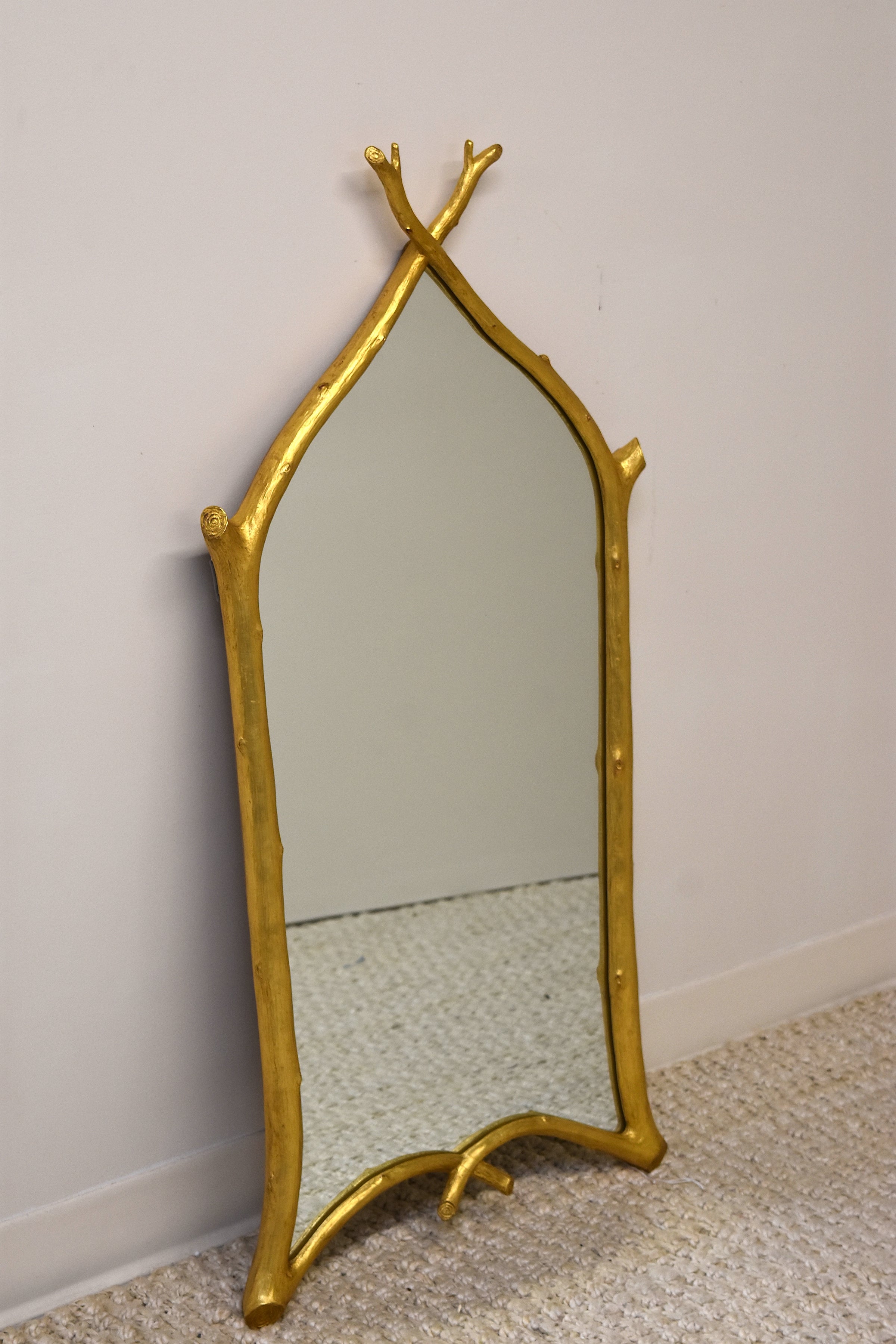 This small Gothic twig mirror features a bold, nature-inspired frame crafted from intricately arranged twigs, finished in a rich gold hue. The combination of rustic, organic design and luxurious gold accents creates a striking focal point, blending gothic style with earthy elegance. Perfect for adding a dramatic touch to entryways, living rooms, or bedrooms, this mirror brings both character and charm to any space.