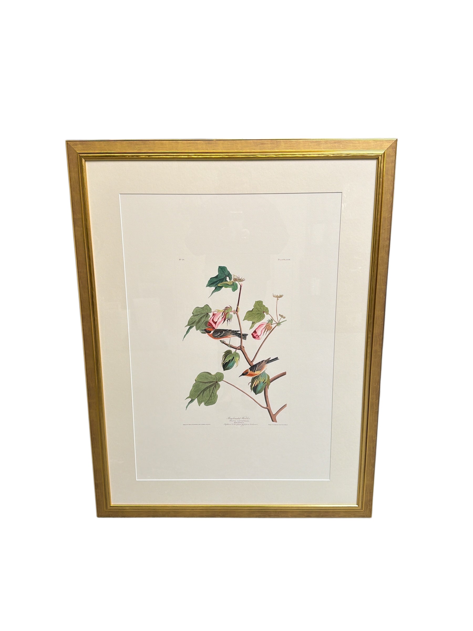 A timeless botanical print featuring a pair of vibrant hummingbirds perched among delicate pink blossoms. Beautifully framed in a gilt wood frame with a double mat, this piece brings both color and elegance to any wall. Perfect for a gallery wall, powder room, or library, it blends natural beauty with classic artistry for a refined touch.