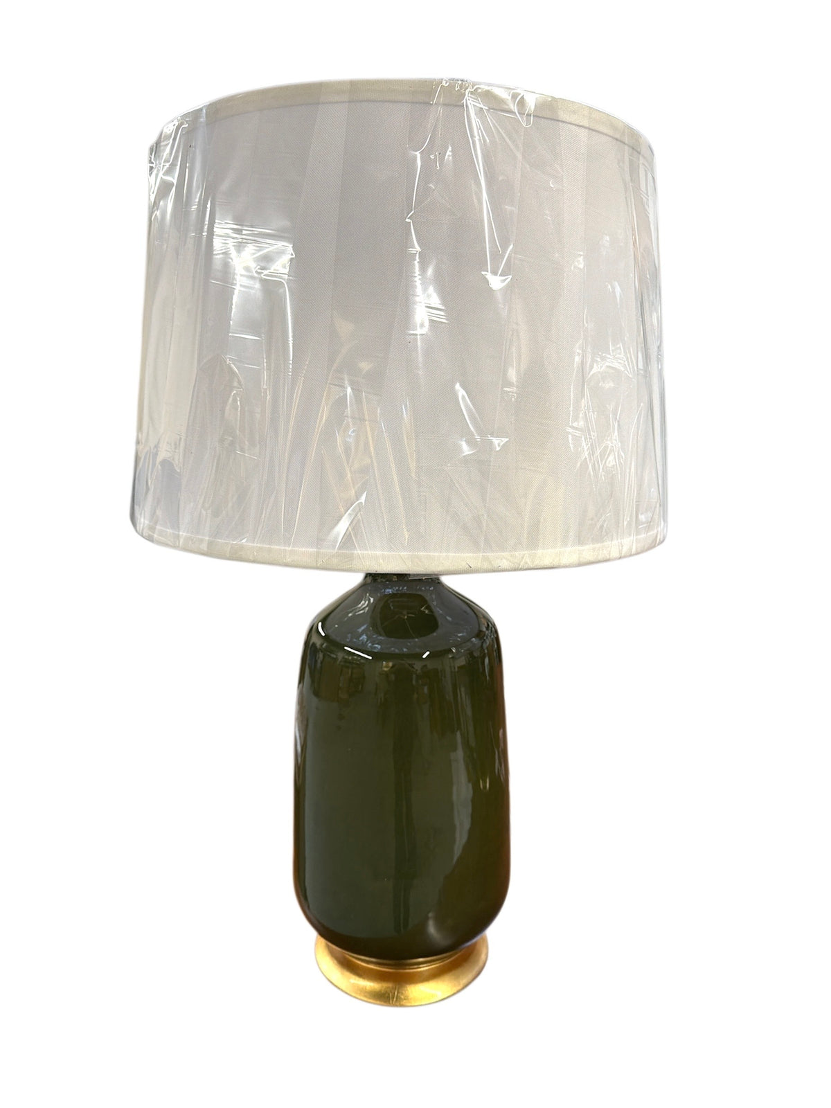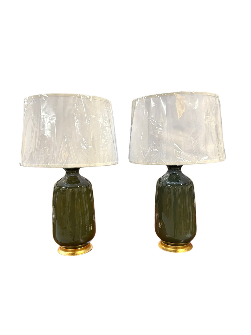 Pair of Black Ribbed Gourd Lamps with Emerald Pleated Shades