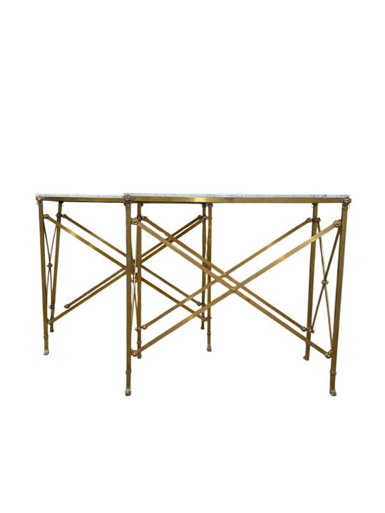 A beautifully refined pair of Directoire console tables, showcasing the perfect balance of classical elegance and architectural simplicity. Each table features a honed white marble top with natural veining, resting on an exquisite gilt-brass base defined by the hallmark Directoire crossed stretcher motif and tapered, fluted legs. The craftsmanship is timeless—graceful proportions, delicate rosette accents, and clean, linear geometry that feels both historic and effortlessly sophisticated. Styled together, they create a striking extended console; used individually, they bring balance and quiet luxury to any room.